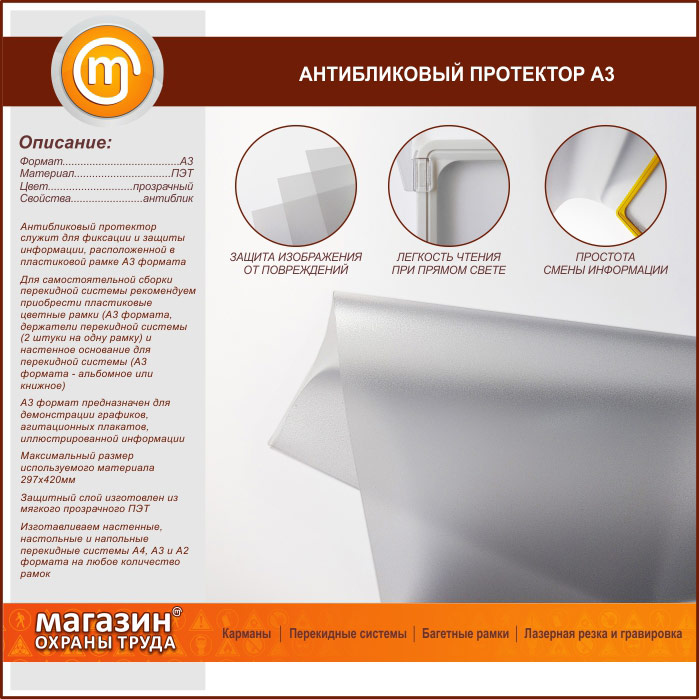 Антибликовые протекторы служат для фиксации и защиты информации, расположенной в пластиковой рамке А3 или А2 формата
