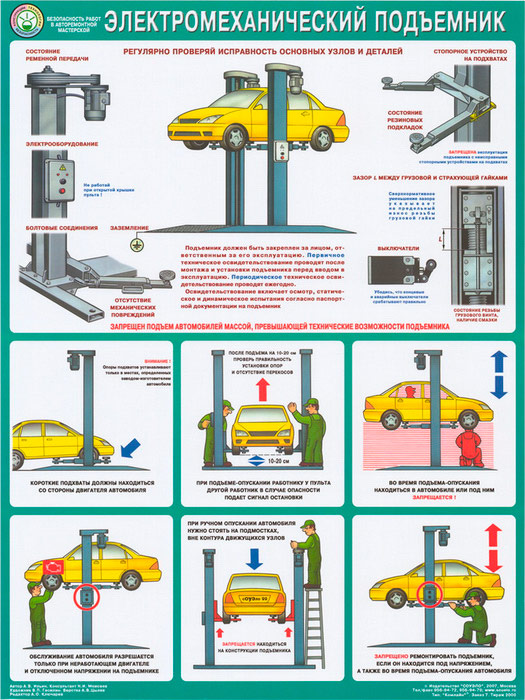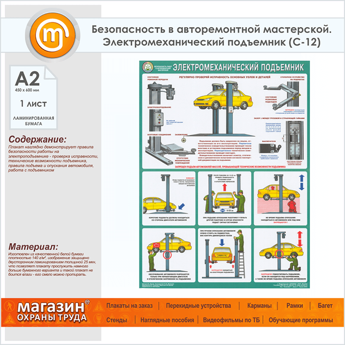 Плакат «Безопасность в авторемонтной мастерской. Электромеханический подъемник» (С-12, ламинированная бумага, А2, 1 лист) в Волгограде купить