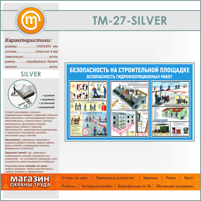 Стенд «Безопасность на строительной площадке. Безопасность гидроизоляционных работ» (TM-27-SILVER) в Волгограде купить
