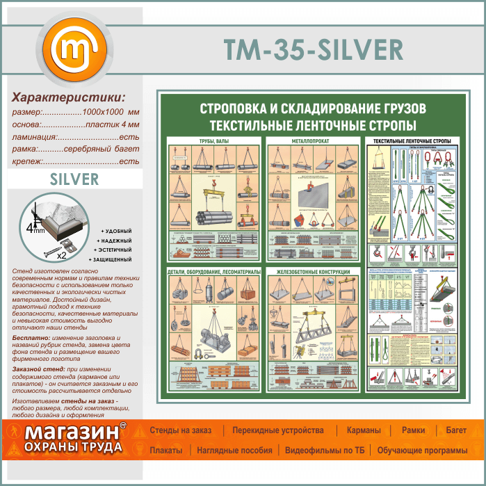 Стенд «Строповка и складирование грузов. Текстильные ленточные стропы» (TM-35-SILVER) в Волгограде купить