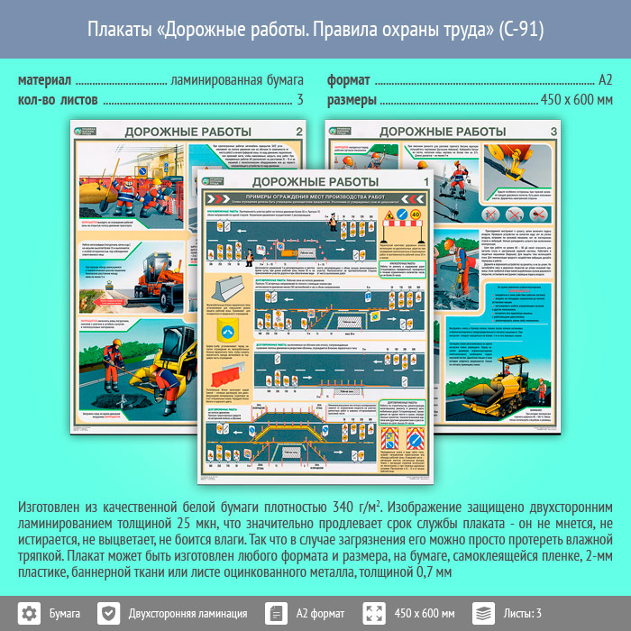 Плакаты «Дорожные работы. Правила охраны труда» (С-91, ламинированная бумага, А2, 3 листа) в Волгограде купить