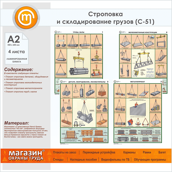 Плакаты «Строповка и складирование грузов» (С-51, ламинированная бумага, А2, 4 листа) в Волгограде купить