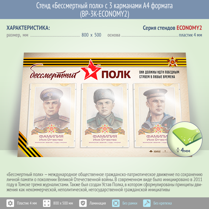 Стенд «Бессмертный полк» с 3 карманами А4 формата (BP-3K-ECONOMY2) в Волгограде купить