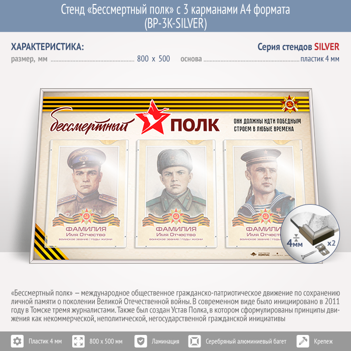 Стенд «Бессмертный полк» с 3 карманами А4 формата (BP-3K-SILVER) в Волгограде купить