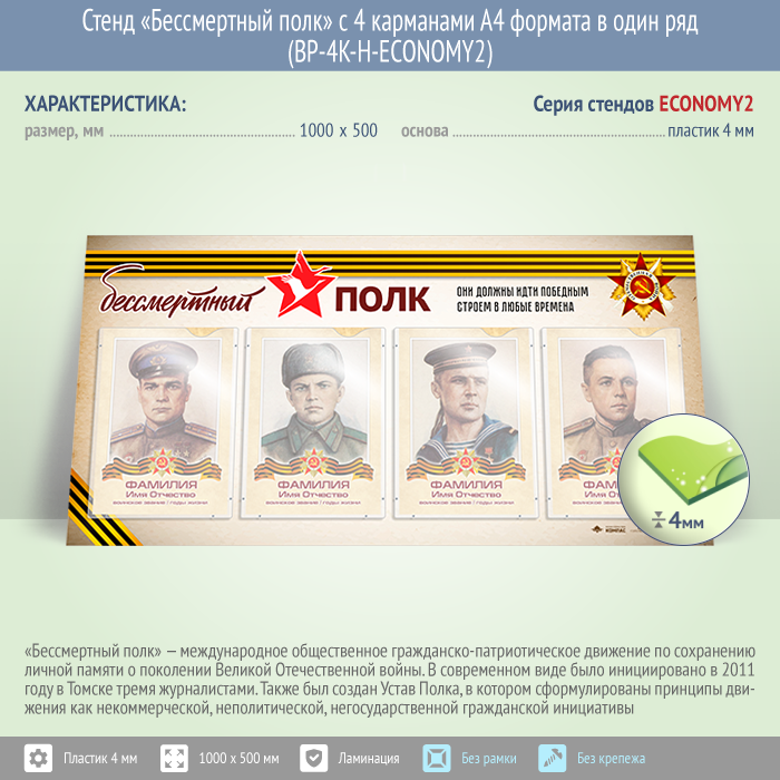 Стенд «Бессмертный полк» с 4 карманами А4 формата в один ряд (BP-4K-H-ECONOMY2) в Волгограде купить