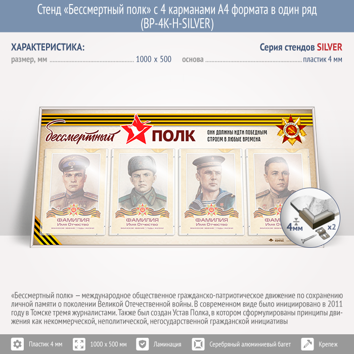 Стенд «Бессмертный полк» с 4 карманами А4 формата в один ряд (BP-4K-H-SILVER) в Волгограде купить