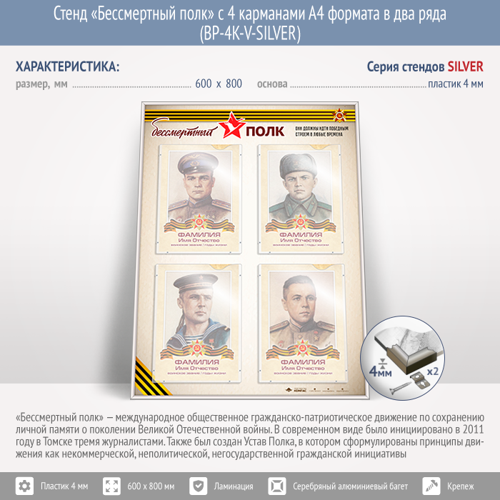 Стенд «Бессмертный полк» с 4 карманами А4 формата в два ряда (BP-4K-V-SILVER) в Волгограде купить