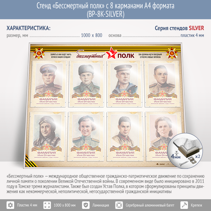 Стенд «Бессмертный полк» с 8 карманами А4 формата (BP-8K-SILVER) в Волгограде купить