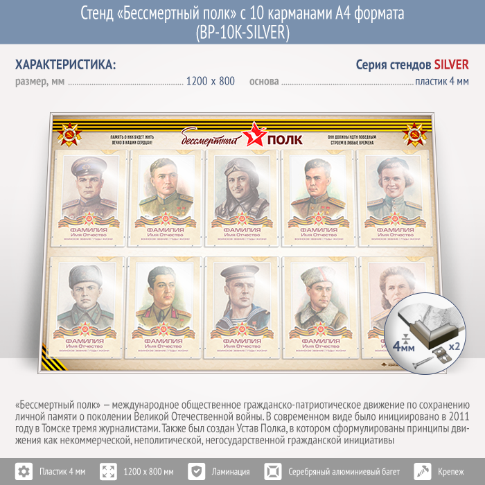 Стенд «Бессмертный полк» с 10 карманами А4 формата (BP-10K-SILVER) в Волгограде купить