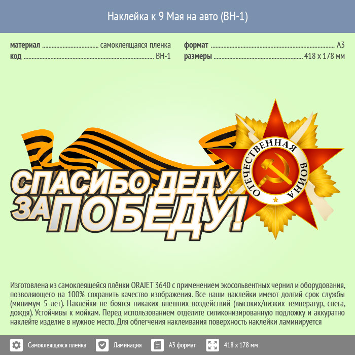 Наклейка к 9 Мая на авто А3 формата (BH-1) в Волгограде купить