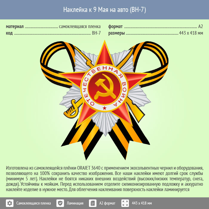 Наклейка к 9 Мая на авто А2 формата (BH-7) в Волгограде купить