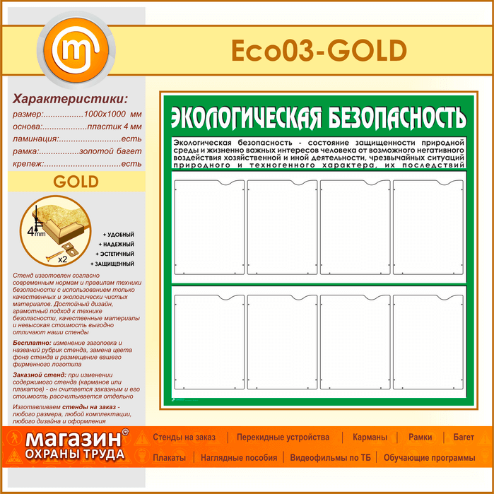 Стенд «Экологическая безопасность» с 8 карманами (ECO-03-GOLD) в Волгограде купить