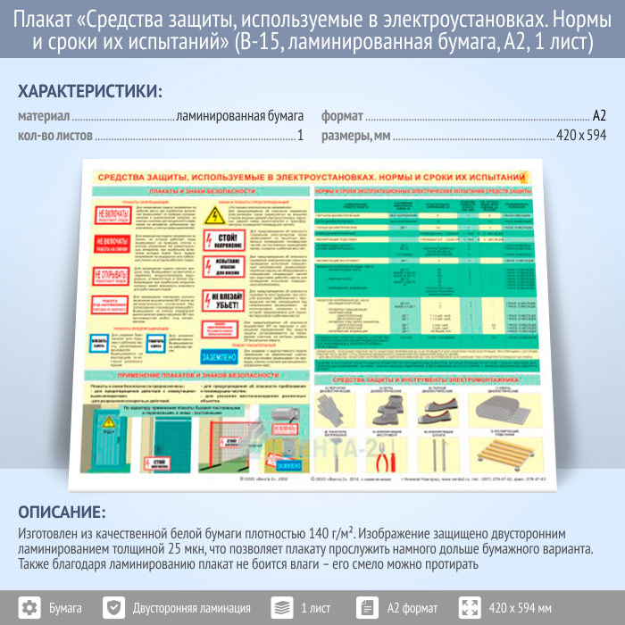 Плакат «Средства защиты, используемые в электроустановках. Нормы и сроки их испытаний» (В-15, ламинированная бумага, А2, 1 лист) в Волгограде купить