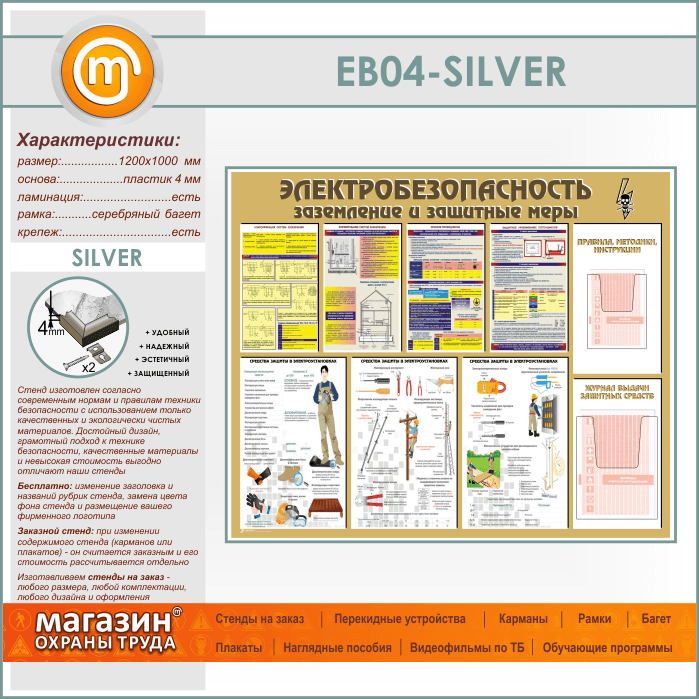 Стенд «Электробезопасность. Заземление и защитные меры» с 2 объемными карманами (EB-04-SILVER) в Волгограде купить