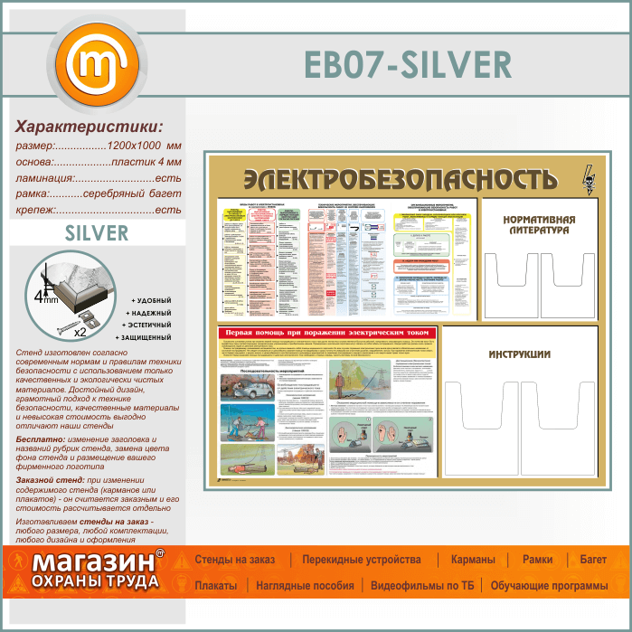 Стенд «Электробезопасность» с 4 объемными карманами (EB-07-SILVER) в Волгограде купить
