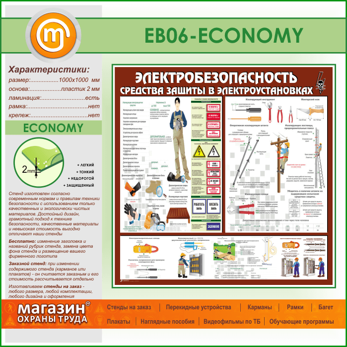 Стенд «Электробезопасность. Средства защиты в электроустановках» (EB-06-ECONOMY) в Волгограде купить