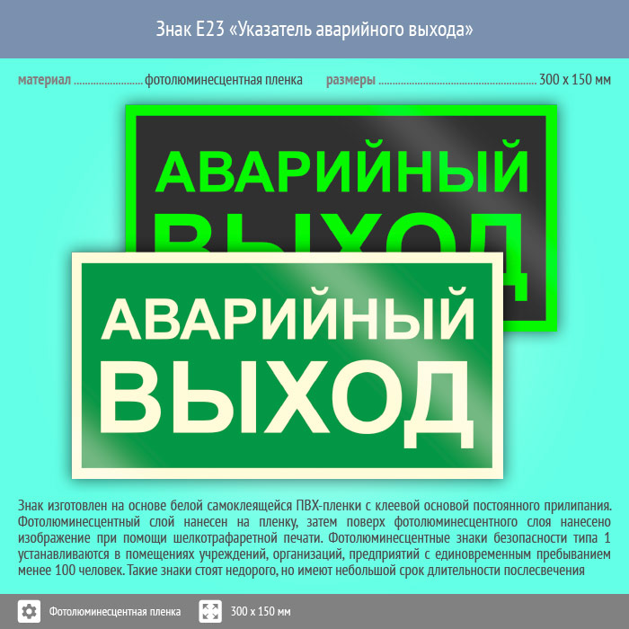 Знак E23 «Указатель аварийного выхода» (фотолюминесцентная пленка, 300х150 мм) в Волгограде купить