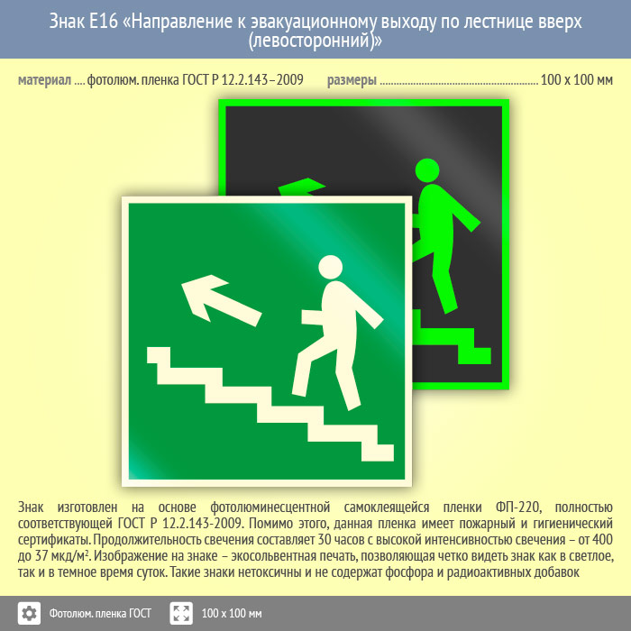 Знак E16 «Направление к эвакуационному выходу по лестнице вверх (левосторонний)» (фотолюминесцентная пленка ГОСТ 34428-2018, 100х100 мм) в Волгограде купить