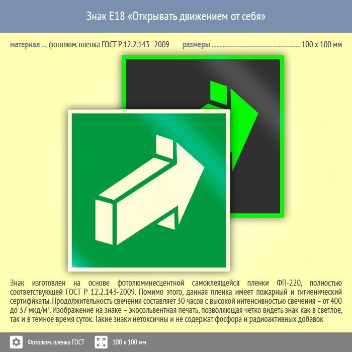 Знак E18 «Открывать движением от себя» (фотолюминесцентная пленка ГОСТ 34428-2018, 100х100 мм) в Волгограде купить