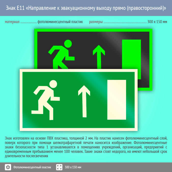 Знак E11 «Направление к эвакуационному выходу прямо (правосторонний)» (фотолюминесцентный пластик, 300х150 мм) в Волгограде купить