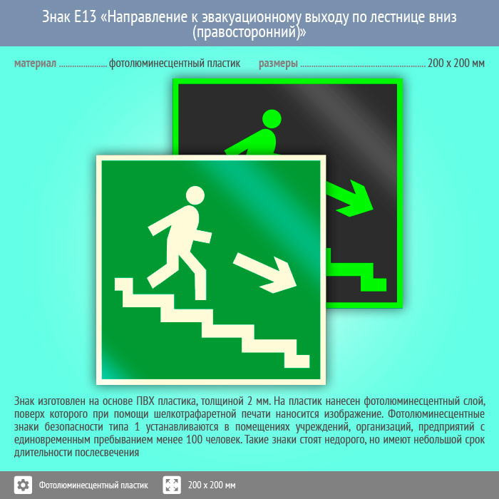 Знак E13 «Направление к эвакуационному выходу по лестнице вниз (правосторонний)» (фотолюминесцентный пластик, 200х200 мм) в Волгограде купить