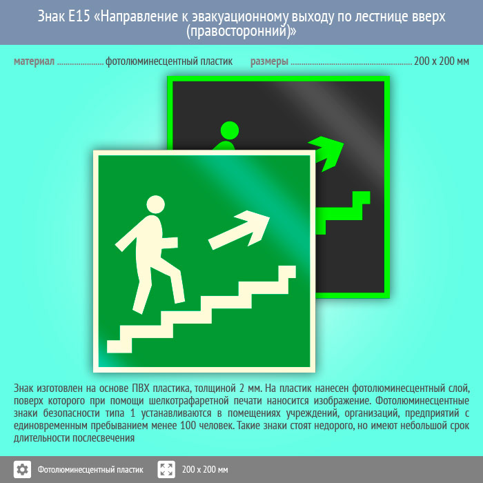 Знак E15 «Направление к эвакуационному выходу по лестнице вверх (правосторонний)» (фотолюминесцентный пластик, 200х200 мм) в Волгограде купить