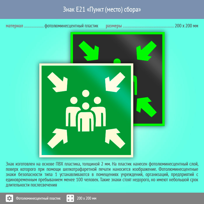 Знак E21 «Пункт (место) сбора» (фотолюминесцентный пластик, 200х200 мм) в Волгограде купить