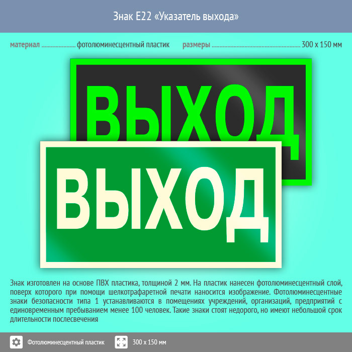 Знак E22 «Указатель выхода» (фотолюминесцентный пластик, 300х150 мм) в Волгограде купить