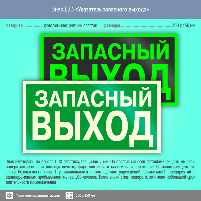 Знак E23 «Указатель запасного выхода» (устаревший) (фотолюминесцентный пластик, 300х150 мм) в Волгограде купить