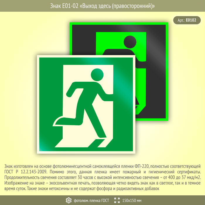 Знак E01-02 «Выход здесь (правосторонний)» (фотолюминесцентная пленка ГОСТ 34428-2018, 150х150 мм) в Волгограде купить
