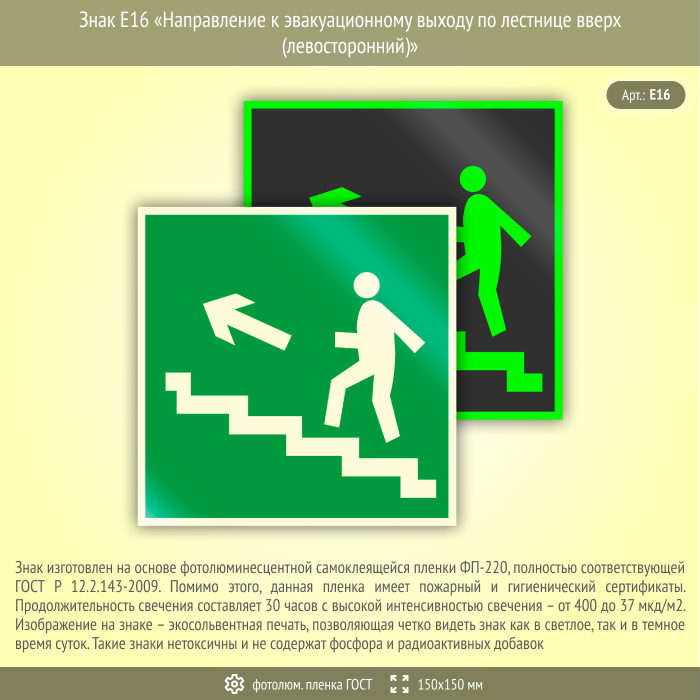 Знак E16 «Направление к эвакуационному выходу по лестнице вверх (левосторонний)» (фотолюминесцентная пленка ГОСТ 34428-2018, 150х150 мм) в Волгограде купить