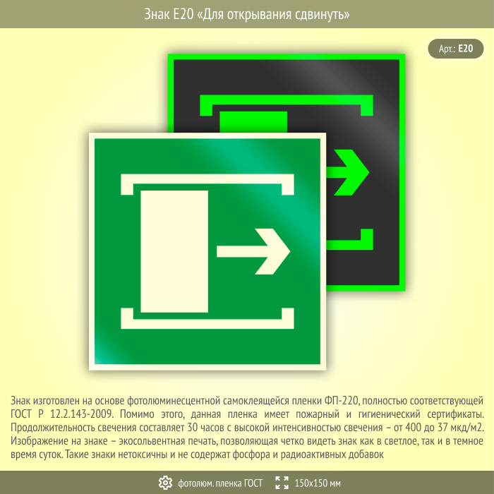 Знак E20 «Для открывания сдвинуть» (фотолюминесцентная пленка ГОСТ 34428-2018, 150х150 мм) в Волгограде купить