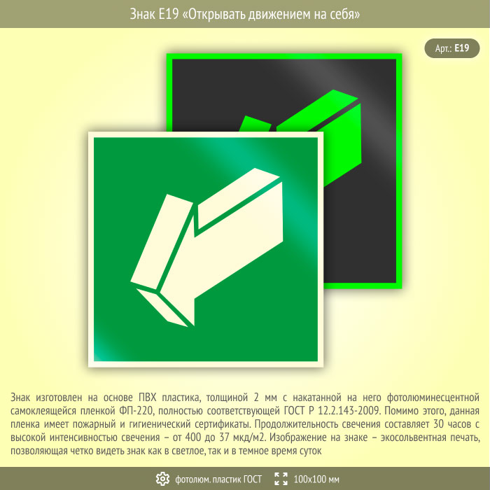 Знак E19 «Открывать движением на себя» (фотолюминесцентный пластик ГОСТ 34428-2018, 100х100 мм) в Волгограде купить