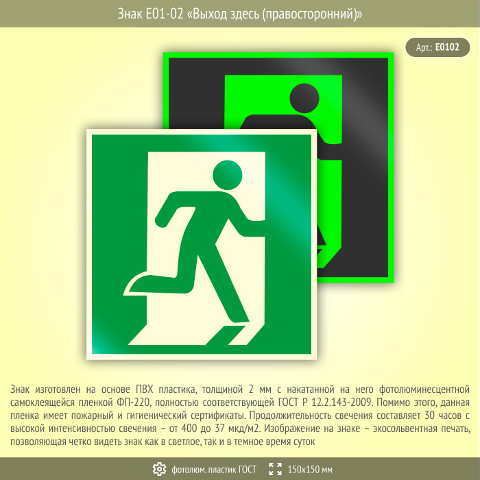 Знак E01-02 «Выход здесь (правосторонний)» (фотолюминесцентный пластик ГОСТ 34428-2018, 150х150 мм) в Волгограде купить