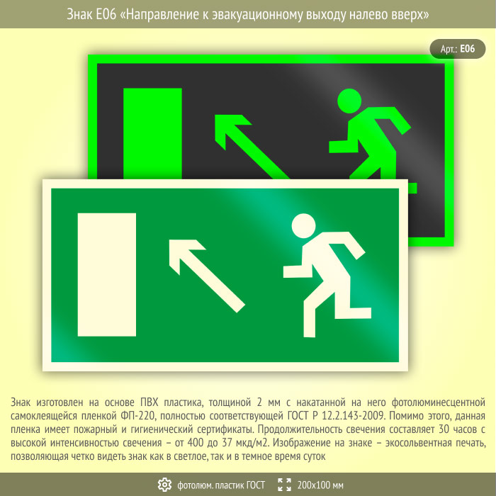 Знак E06 «Направление к эвакуационному выходу налево вверх» (фотолюминесцентный пластик ГОСТ 34428-2018, 200х100 мм) в Волгограде купить
