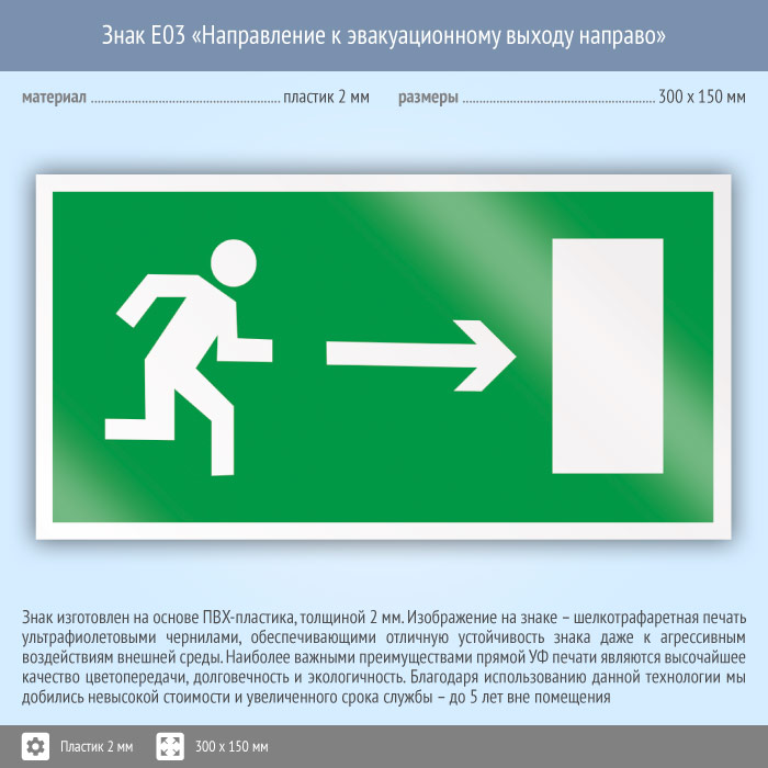 Знак E03 «Направление к эвакуационному выходу направо» (пластик, 300х150 мм) в Волгограде купить