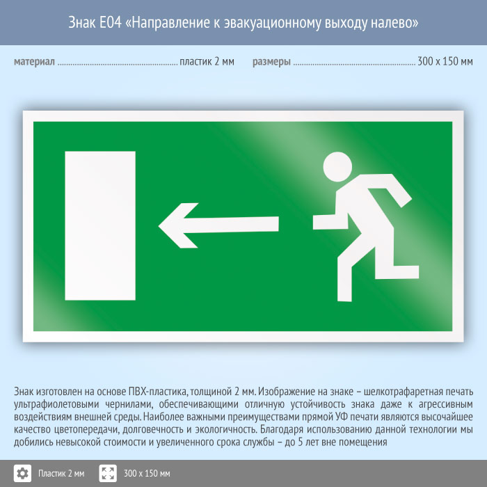Знак E04 «Направление к эвакуационному выходу налево» (пластик, 300х150 мм) в Волгограде купить