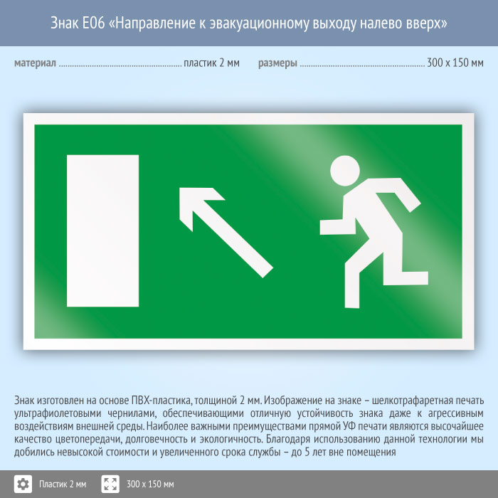 Знак E06 «Направление к эвакуационному выходу налево вверх» (пластик, 300х150 мм) в Волгограде купить