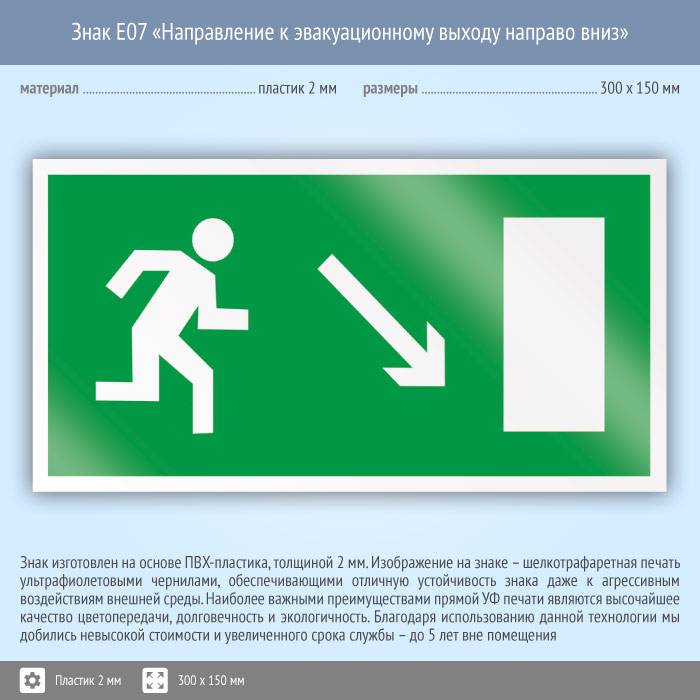 Знак E07 «Направление к эвакуационному выходу направо вниз» (пластик, 300х150 мм) в Волгограде купить