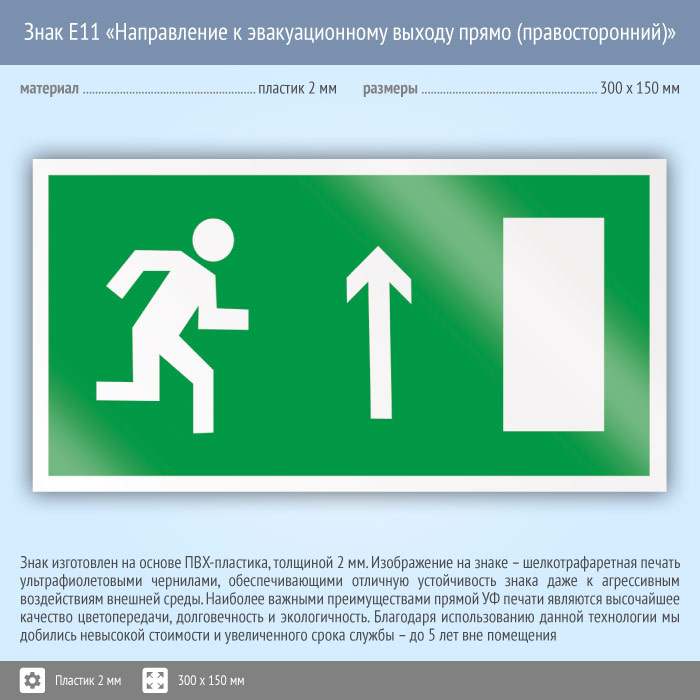 Знак E11 «Направление к эвакуационному выходу прямо (правосторонний)» (пластик, 300х150 мм) в Волгограде купить