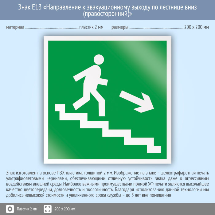 Знак E13 «Направление к эвакуационному выходу по лестнице вниз (правосторонний)» (пластик, 200х200 мм) в Волгограде купить
