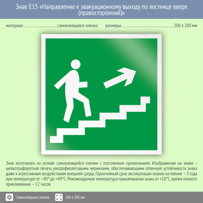 Знак E15 «Направление к эвакуационному выходу по лестнице вверх (правосторонний)» (пленка, 200х200 мм) в Волгограде купить
