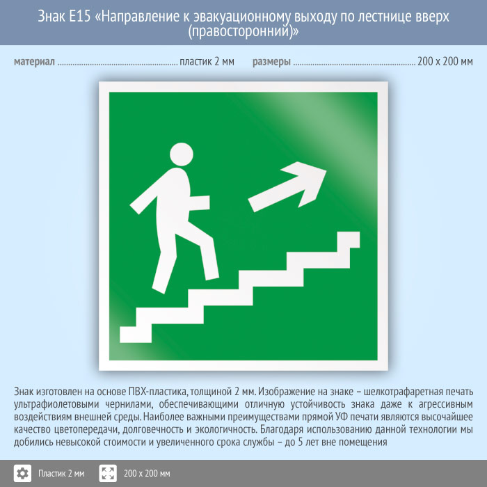 Знак E15 «Направление к эвакуационному выходу по лестнице вверх (правосторонний)» (пластик, 200х200 мм) в Волгограде купить