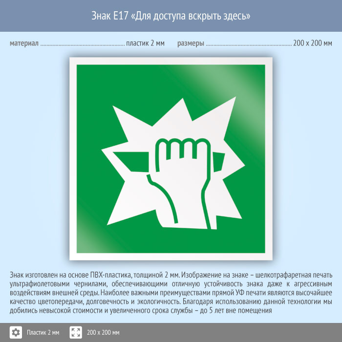 Знак E17 «Для доступа вскрыть здесь» (пластик, 200х200 мм) в Волгограде купить