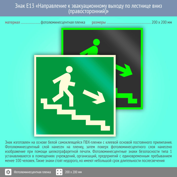 Знак E13 «Направление к эвакуационному выходу по лестнице вниз (правосторонний)» (фотолюминесцентная пленка, 200х200 мм) в Волгограде купить