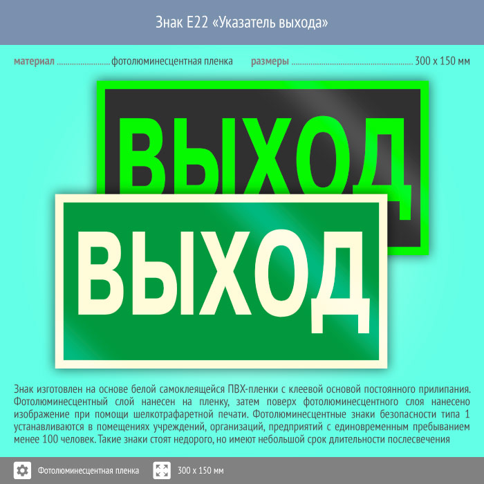Знак E22 «Указатель выхода» (фотолюминесцентная пленка, 300х150 мм) в Волгограде купить