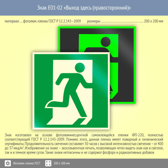 Знак E01-02 «Выход здесь (правосторонний)» (фотолюминесцентная пленка ГОСТ 34428-2018, 200х200 мм) в Волгограде купить