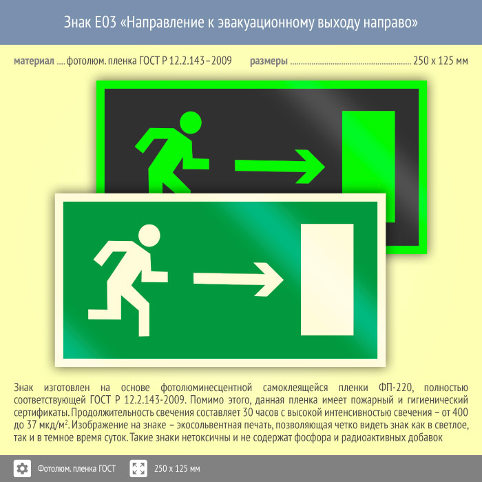 Знак E03 «Направление к эвакуационному выходу направо» (фотолюминесцентная пленка ГОСТ 34428-2018, 250х125 мм) в Волгограде купить