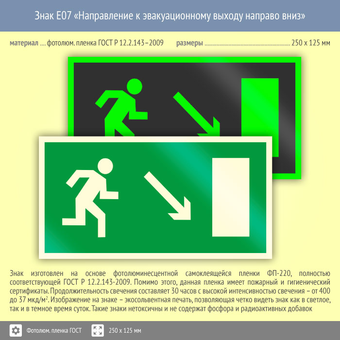 Знак E07 «Направление к эвакуационному выходу направо вниз» (фотолюминесцентная пленка ГОСТ 34428-2018, 250х125 мм) в Волгограде купить