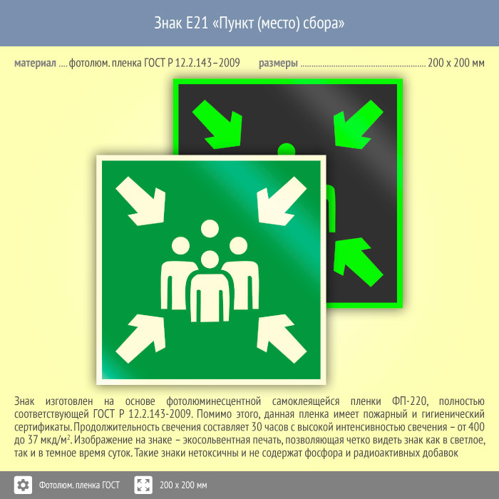 Знак E21 «Пункт (место) сбора» (фотолюминесцентная пленка ГОСТ 34428-2018, 200х200 мм) в Волгограде купить